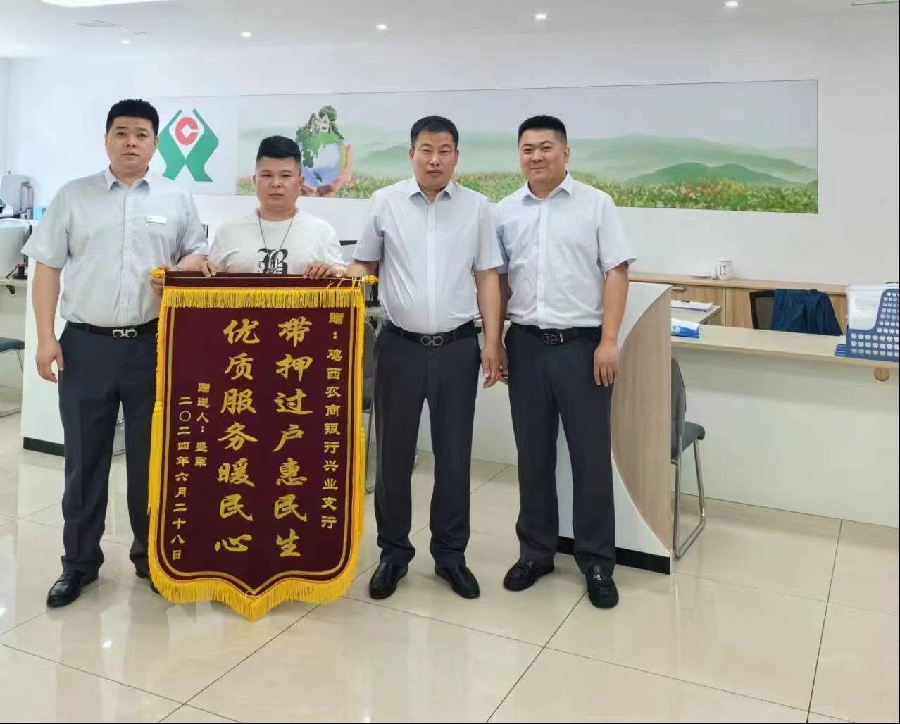 近日,市民盛先生为鸡西农商银行兴业支行送来一面绣有“带押过户惠民生 优质服务暖民心”的锦旗。以此感谢6月27日为其成功发放“带押过户”贷款,有效解决了房屋在抵押状态下办理转移登记的难题。