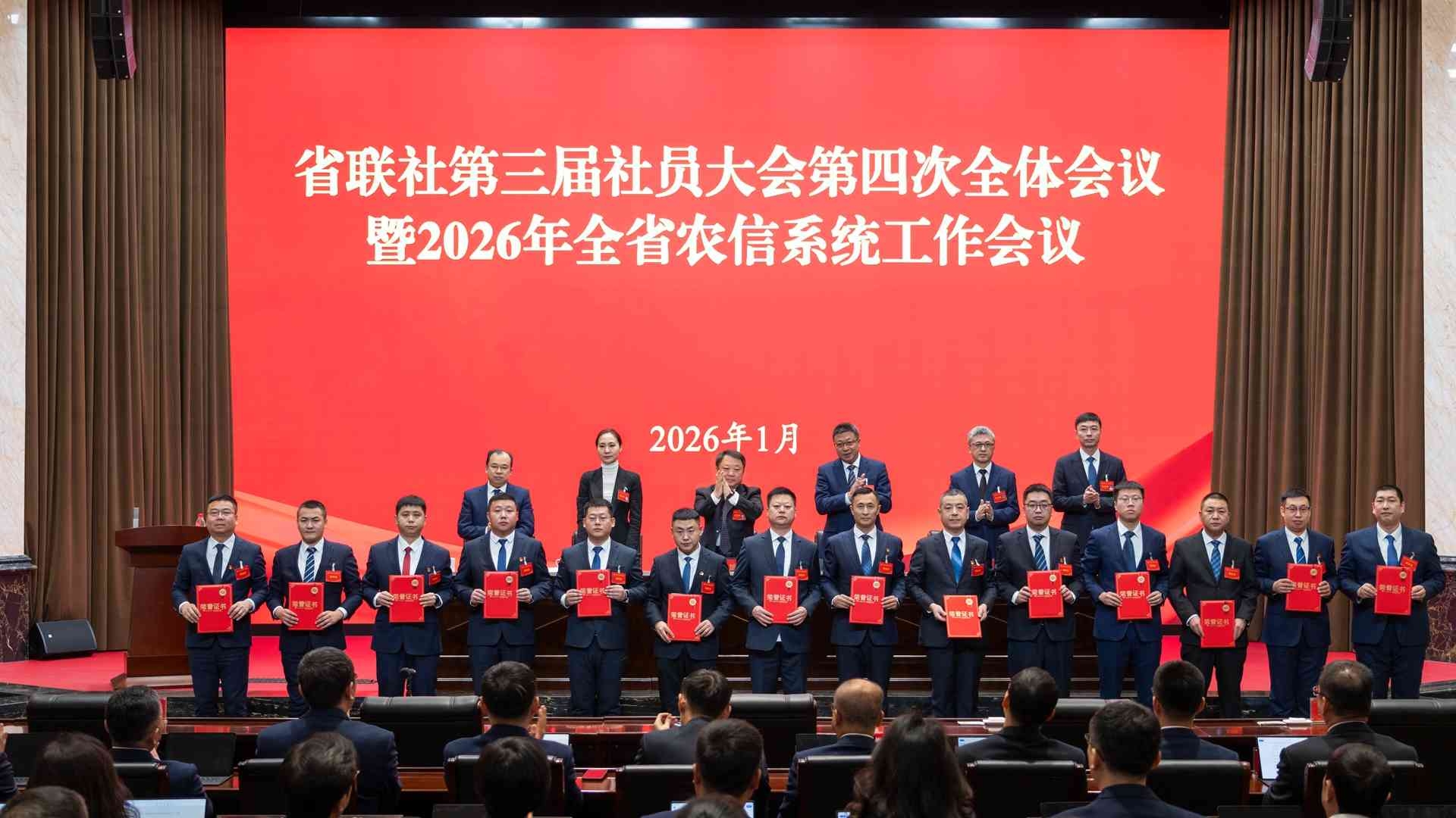 1月30日,省联社召开第三届社员大会第四次全体会议暨2026年全省农信系统工作会议,全面总结2025年工作,深入分析当前形势,研究部署2026年工作,隆重表彰2025年度先进单位和先进个人,3家法人行社作会议发言,综合计划部负责人作2025年度经营分析报告,省联社党委书记、理事长刘长旭作工作报告,省联社党委副书记、主任盛象斌主持会议。