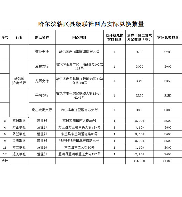 第二批猴年币哈尔滨辖区县级联社实际兑换数量