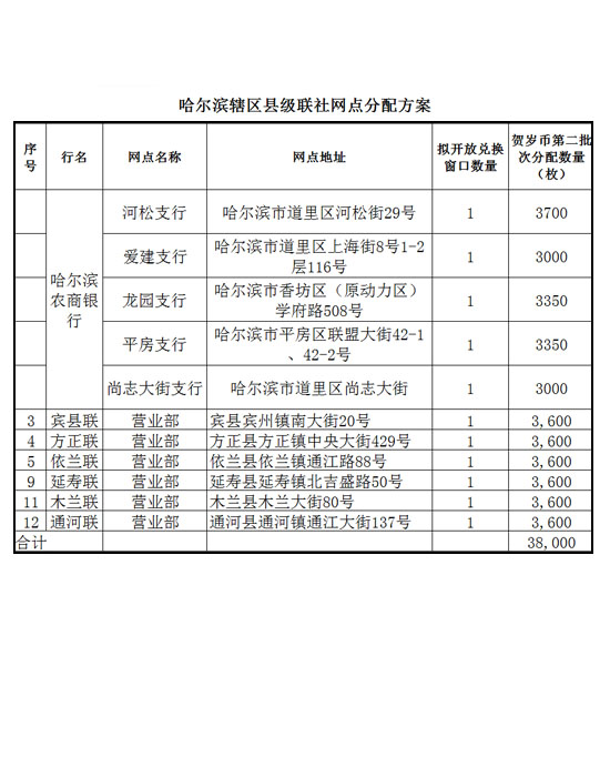 第二批猴年币哈尔滨辖区县级联社网点分配方案