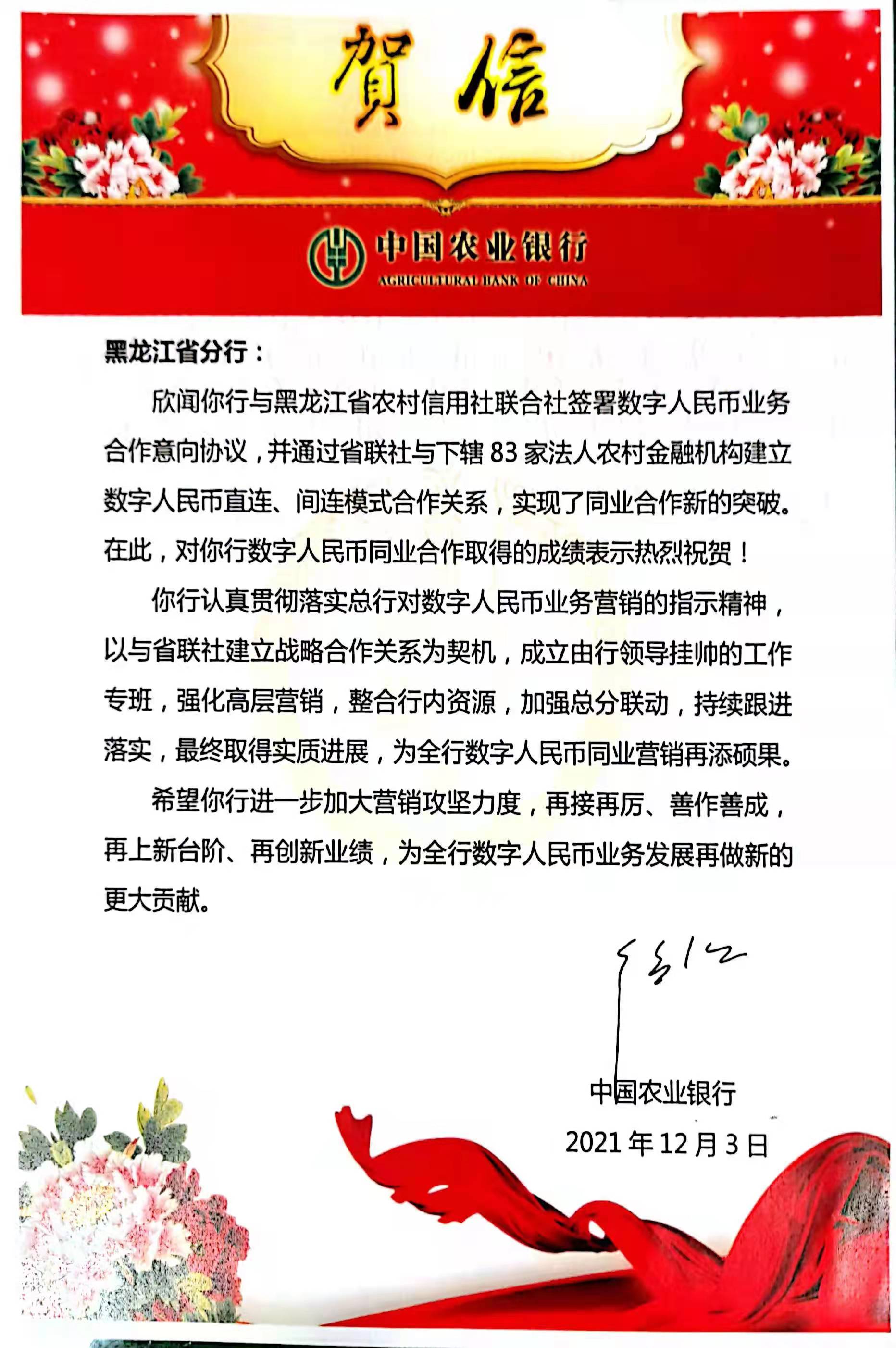 近日,省联社与中国农业银行黑龙江省分行成功签署数字人民币合作协议,为全省农信系统数字人民币创新应用推广奠定基础。中国农业银行总行高度重视此次合作,党委委员、副行长崔勇亲自向中国农业银行黑龙江省分行发来贺信。
